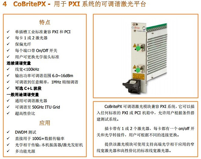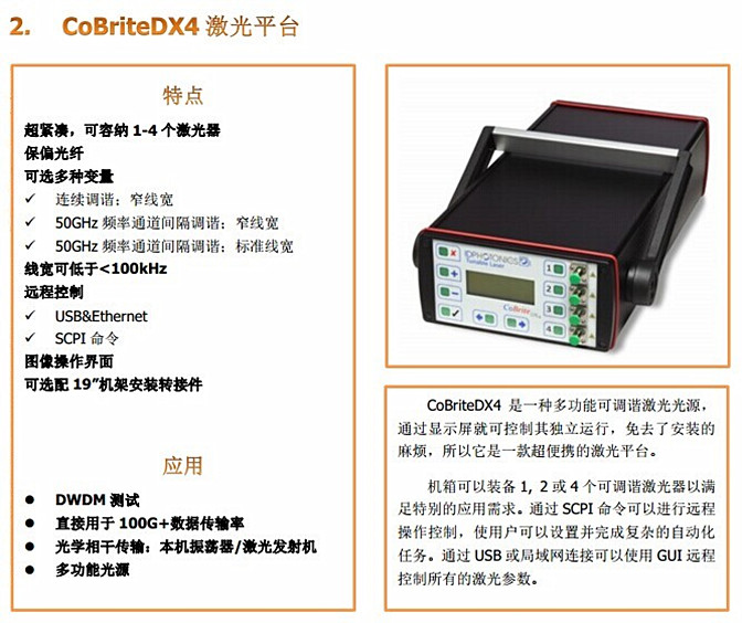 ID Photonics为光学远程通信行业提供测试设备和方案,其主要产品是新兴市场中面向光学相干传输系统的CoBrite系列为可调谐激光光源。CoBrite可调谐激光系统可以为单通道应用到104个激光器的多通道应用提供完备的解决方案。